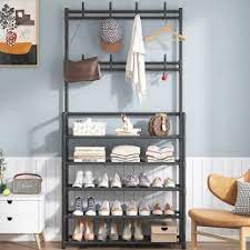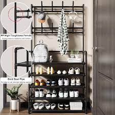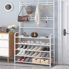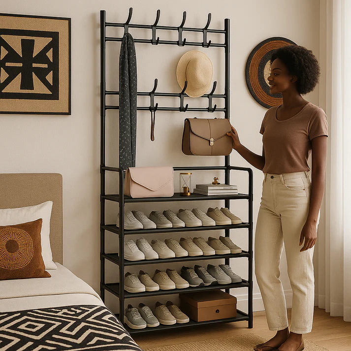 Organisez facilement jusqu’à 5 niveaux de chaussures tout en ayant des crochets pour vos vestes, sacs, et accessoires. Conçue avec un design pratique et moderne, cette étagère apporte non seulement de l’ordre mais aussi du style à votre espace !